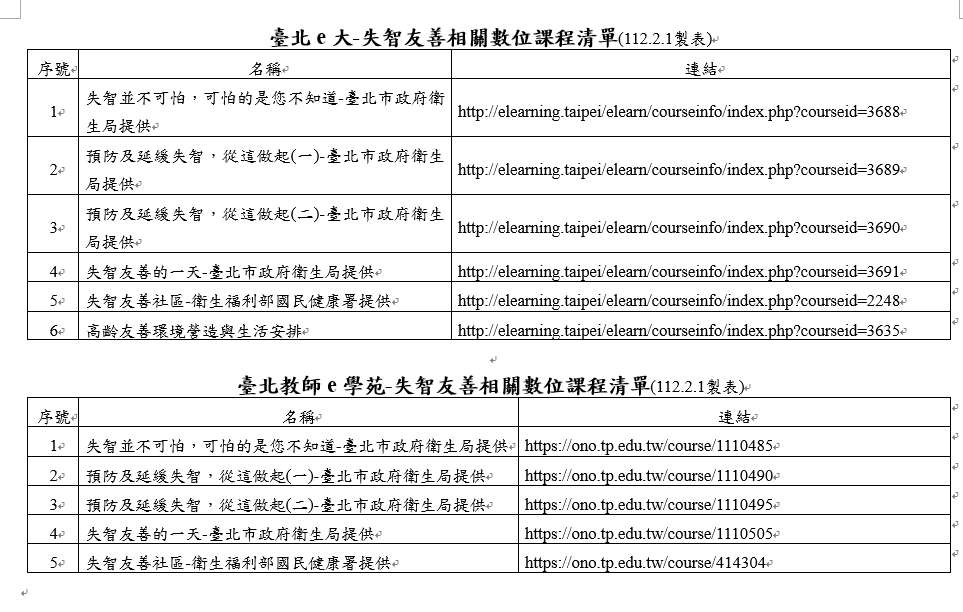 二、為增進學校人員對失智症認識,市府衛生局於「臺北e大數 位學習網」及「教師e學苑平台」提供多堂線上影音課程 (詳細請見附件),請本市所屬機關學校人員(含教職員)完成 線上課程學習時數。
