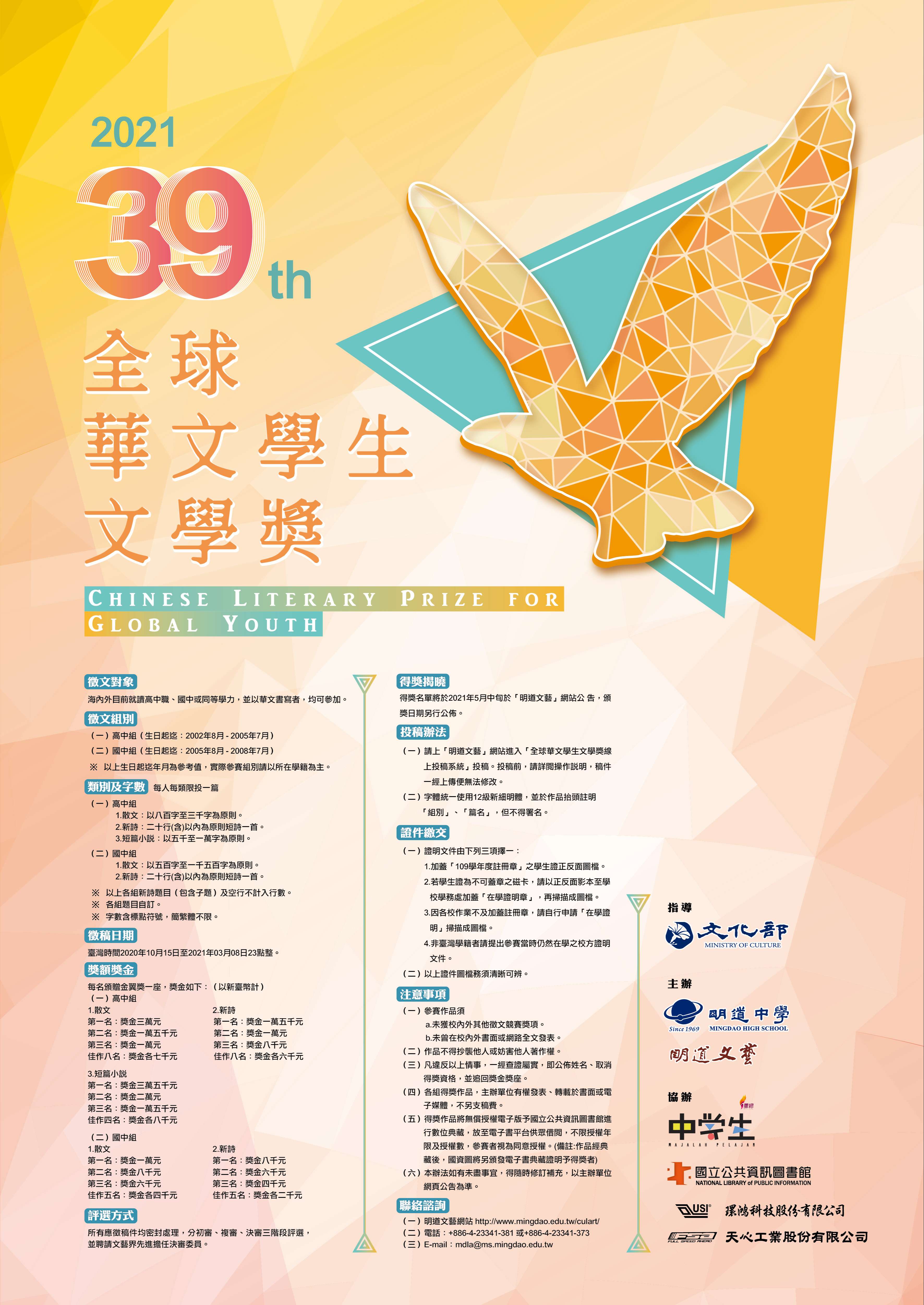 一、「第39屆全球華文學生文學獎」徵文對象為海內外目前就 讀高中職、國中或同等學力,並以華文書寫者,均可參 加。