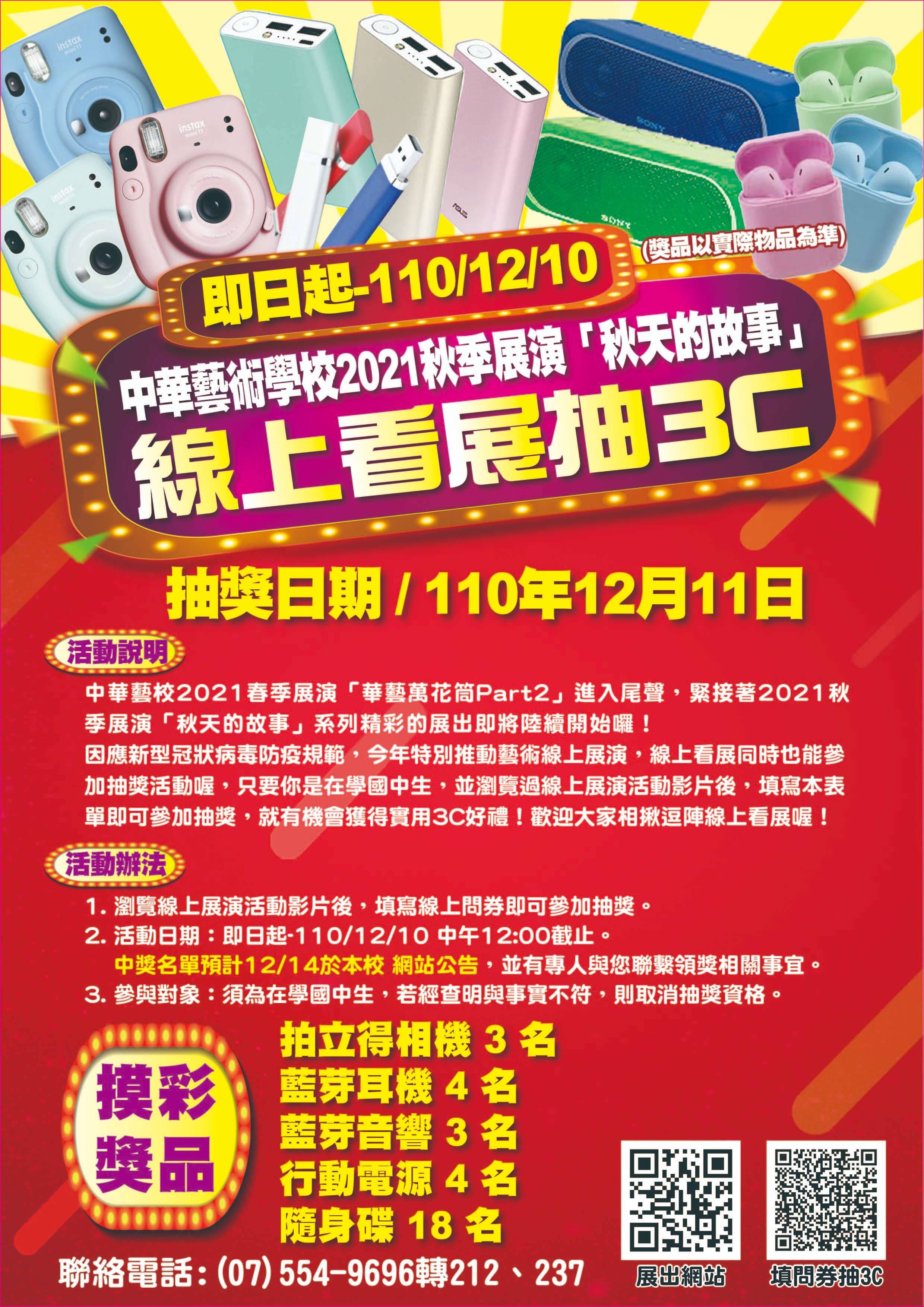 一、因應新型冠狀病毒防疫規範,中華藝校今年特別推動藝術 線上展演,瀏覽線上展演活動影片後填寫線上問卷即可參 加抽獎活動。