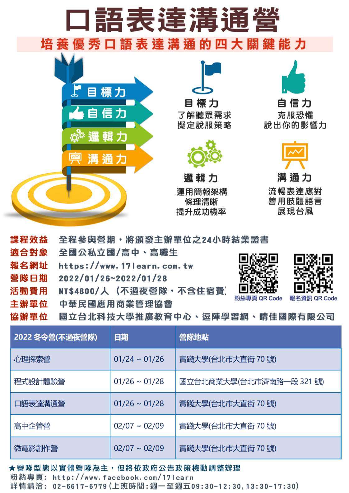 無論是升學口試或求職面談,口語表達已經是現代人不可 或缺的能力。「口語表達溝通營」透過講解、示範、訓練 和不斷的演練,克服公開發言的恐懼,人人都可以成為口 語表達的高手!