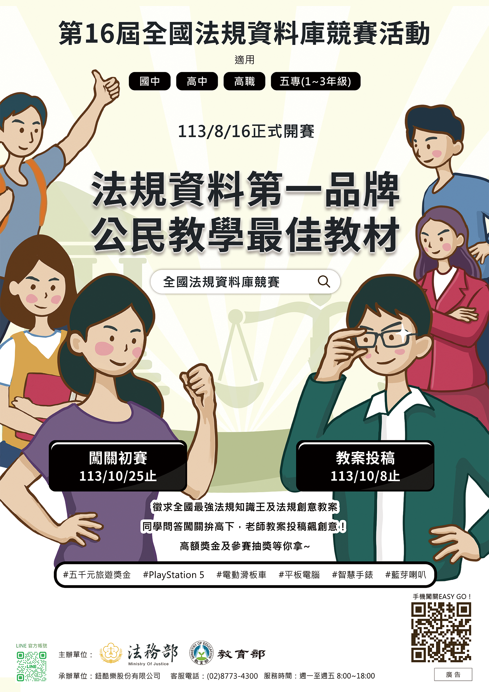 二、全國法規資料庫競賽活動,係法務部與教育部自97年起共同舉辦的競賽活動,目的為宣導全國國中、高中職(含五 年制專科學校一、二、三年級)學生善用「全國法規資料庫」,建立知法守法的觀念,以及期許全國國中及高中職 (含五年制專科學校)教師發揮創意將「全國法規資料庫」資源融入教學的競賽活動,本屆2式競賽活動內容如下: (一)法規知識王網路闖關競賽: 1、活動對象:全國國中及高中職(含五年制專科學校一、二、三年級)學生(分國中學生組及高中職學生 組)。 2、活動方式:採網路初賽及現場決賽兩階段競賽。 3、網路初賽:自113年8月16日起至113年10月25日止。 (二)創意教學競賽: 1、活動對象:全國國中及高中職(含五年制專科學校) 教師(含兼任教師、代理(課)教師、實習教師及教 官)(分國中組及高中職組)。 2、活動方式:運用「全國法規資料庫」融入法治教育相 關議題進行教案設計,本屆教案甄選主題如下: (1)人權法治與性別平等議題。 (2)重大修法議題。 (3)資訊與網路安全議題。 (4)其他與法治教育相關議題。 3、報名期間:自113年8月16日起至113年10月8日止。 三、請貴校於活動期間內利用學校網站或跑馬燈協助活動宣 導,相關活動文宣及網站連結圖示,請逕至「第16屆全 國 法規資料庫競賽活動網站」(網址https://compete. law. moj.gov.tw/)之「下載與宣導」下載。