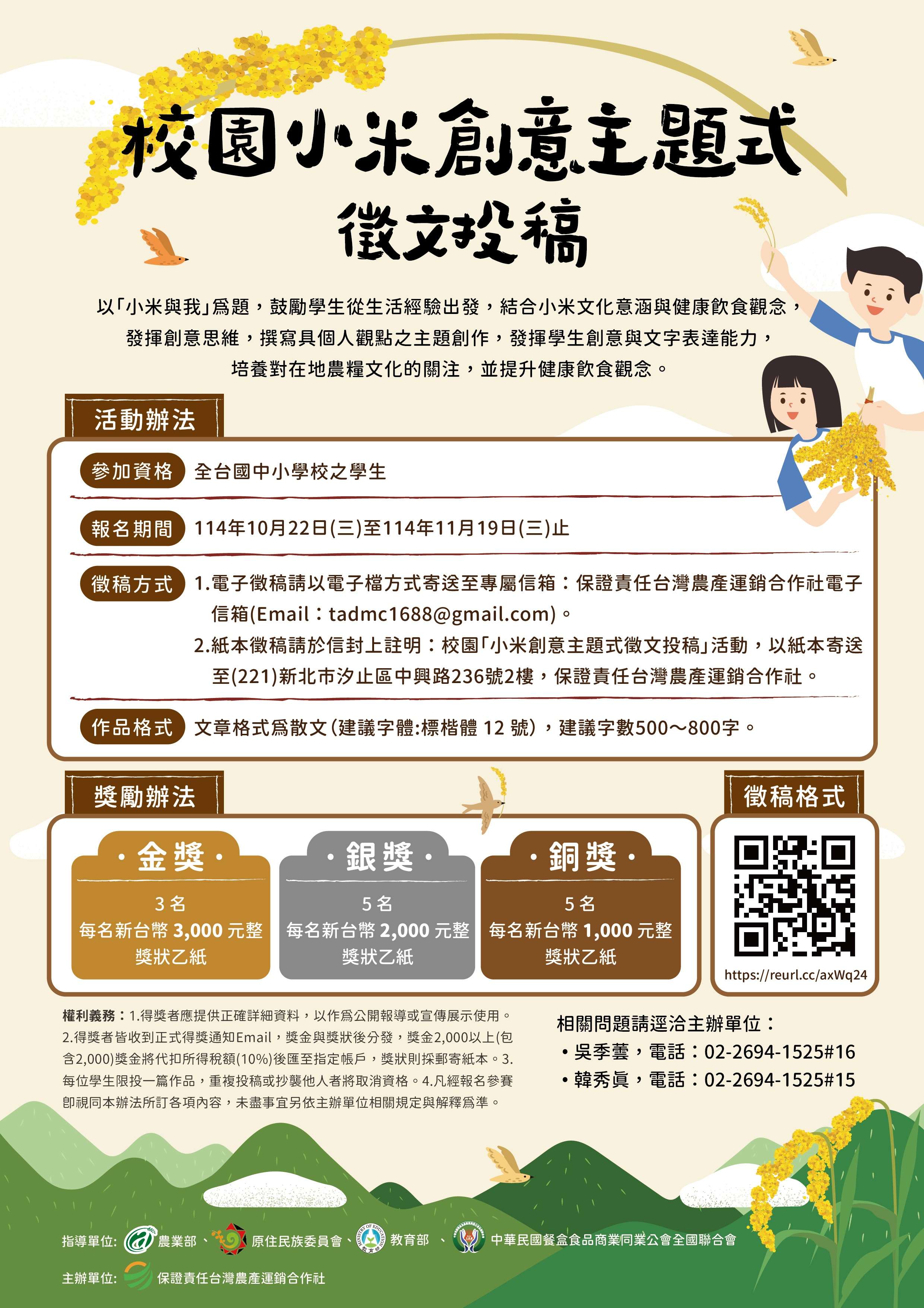 (四)、活動內容:以「小米與我」為題,鼓勵學生結合生活經驗、小米文化與健康飲食觀念,發揮創意撰寫具個人觀點的作品。