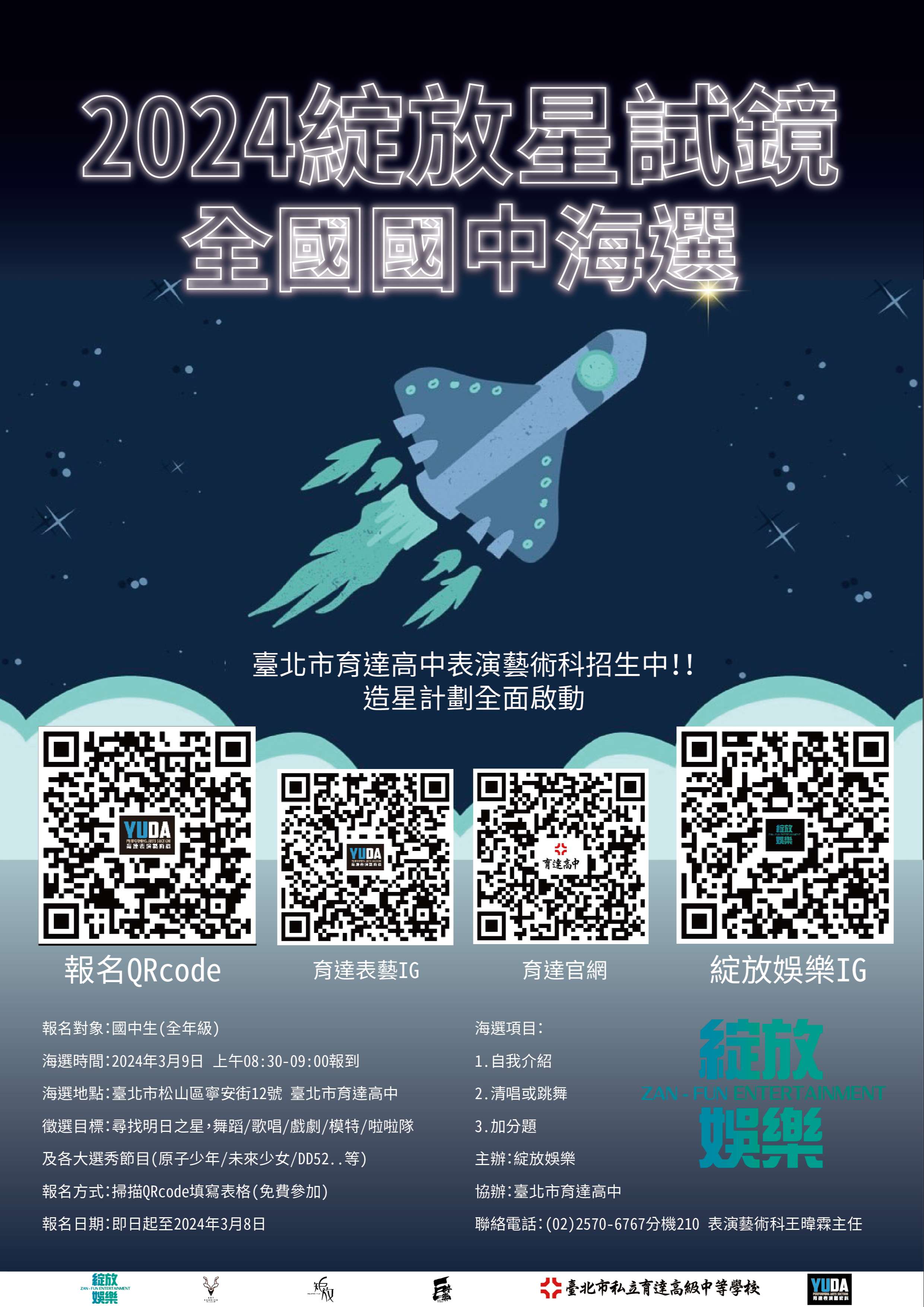 一、綻放娛樂舉辦「2024 綻放星試鏡 - 全國國中海選」,定 於2024年3月9日 星期六。